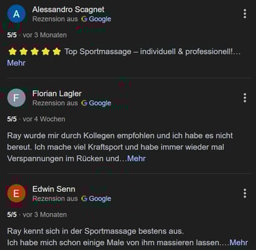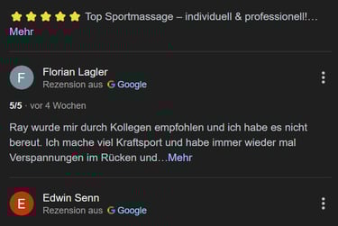 Ich war bei Ray für eine Massage und kann ihn wärmstens empfehlen. Er versteht sein Handwerk und geht gezielt auf Verspannungen ein – professionell, achtsam und mit spürbarer Erfahrung. Nach der Behandlung habe ich mich deutlich entspannter und beweglicher gefühlt.